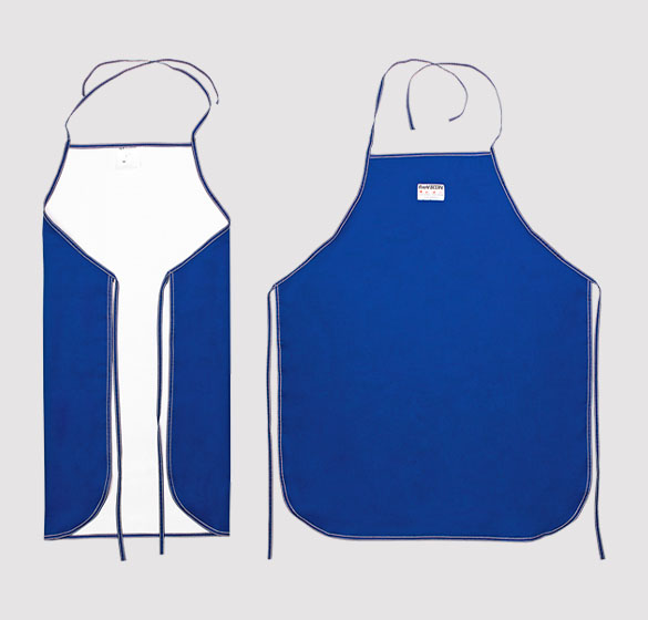 Avental de seguranca confeccionado em tecido de algodão, com tratamento antichamas e impermeabilizado em silicone, costurado com linhas de para-aramida, ajustável através de tiras, sem forro.CA 29046