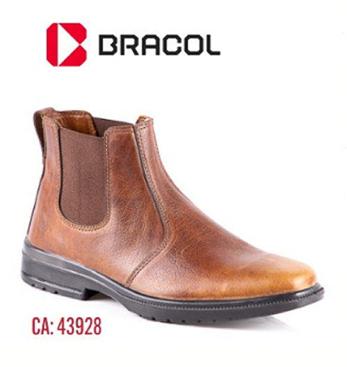 Calçado ocupacional confeccionado em vaqueta hidrofugada, com fechamento em elástico, biqueira plástica conformação, solado de poliuretano bidensidade com propriedade antiderrapante e sistema de absorção de energia na região do salto e resistente ao óleo combustível.C.A 43.928DETALHES