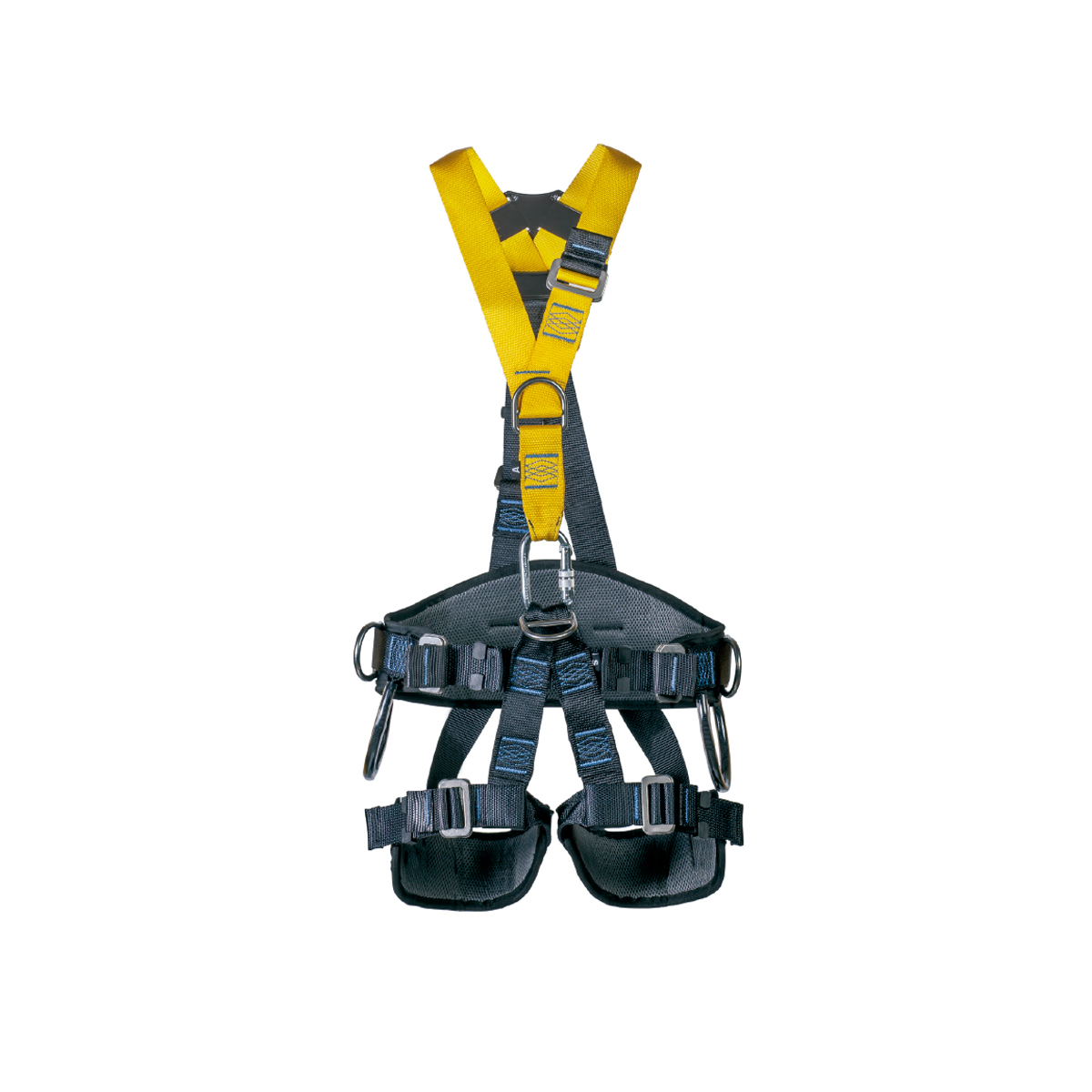 Cinturão de segurança do tipo para quedista, modelo “Y” cadeirinha com 4 pontos de conexão  Cinturão abdominal integrado Conexão dorsal, uma argola “D” inclinada, em aço utilizada para retenção de queda (A)  Conexão peitoral, uma argola “D” inclinada, emaço utilizada para retenção de queda (A)  Conexão lateral, duas argolas “D” inclinadas, em aço utilizadas para posicionamento em altura (P)  Conexão umbilical, uma argola “D” inclinada, em aço, utilizada para suspensão/sustentação (S)  Conforto em espuma EVA na região lombar e nas pernas  Confeccionado em material sintético, Fita primária em poliéster 45mm de alta tenacidade  Um conector classe “B” dupla trava Oval em aço, abertura de 20 mm  Seis pontos de regulagem, com fivelas duplas sem pino em aço,(2 pernas, 1 cintura, 2 suspensório e 1 dorsal)  Dispositivos em polímero complementar à regulagem para armazenar a sobra da fita  Alças laterais para descanso de talabarte ou porta ferramentas–capacidade 5 kg