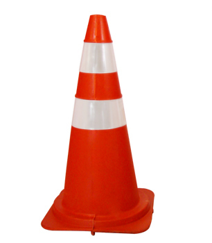 Cone de borracha de 75 cm de altura, base de 40×40 cm, na cor laranja, com 2 faixas refletivas na cor branca, compatível com NBR 15071.