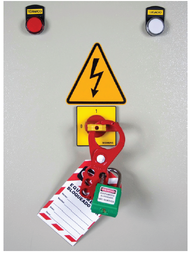 Marca: TagoutDescrição:Garras Metálicas de Bloqueio para travamento com 6 furosrevestidas com tinta isolante elétrica na cor vermelha. Opção defornecimento com ou sem corrente de aço. Podem ser usados até6 cadeados simultaneamente. Ideais para bloqueio de válvulas edisjuntores em geral.Cada funcionário envolvido na manutenção coloca seu cadeado e sua etiqueta de identificação