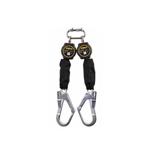 Trava-quedas Retrátil duplo 1,8 metros em fita de poliéster alta tenacidade de 21 mm com absorvedores deenergia, um conector classe “B” em aço com trava rosca e abertura de 18 mm e 2 conectores classe “A” em açocom abertura de 55mm